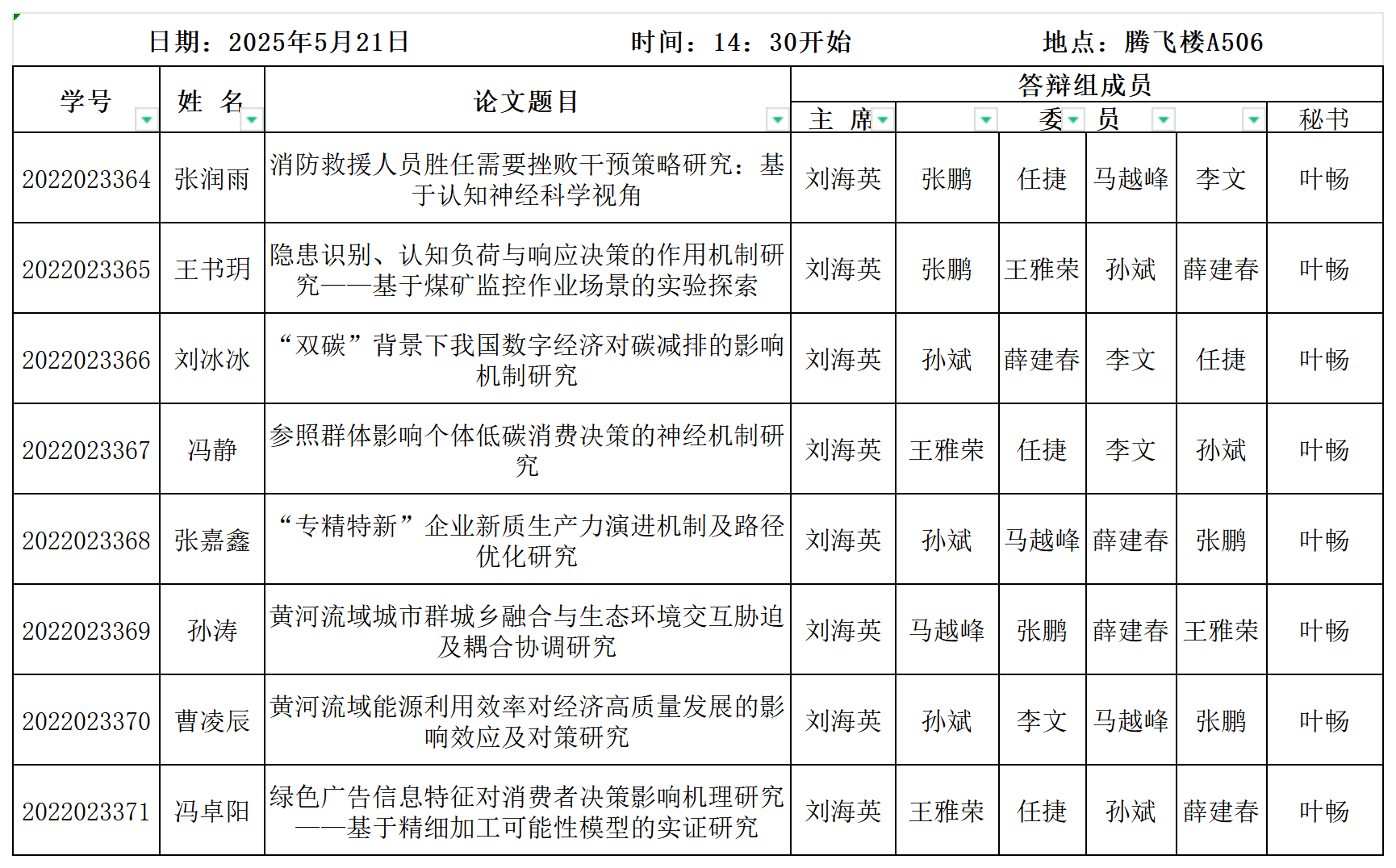 2024-2025学年第二学期管理科学与工程专业学术型硕士学位论文答辩安排