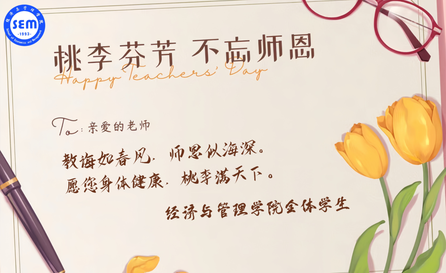 今天,太阳集团tyc5997全体学生向您致以最热烈的教师节祝福。第39个教师节,这是属于您的节日,一个值得我们所有人感恩和纪念的日子。在这个特殊的日子里,我们想对您说一声:老师,您辛苦了!
