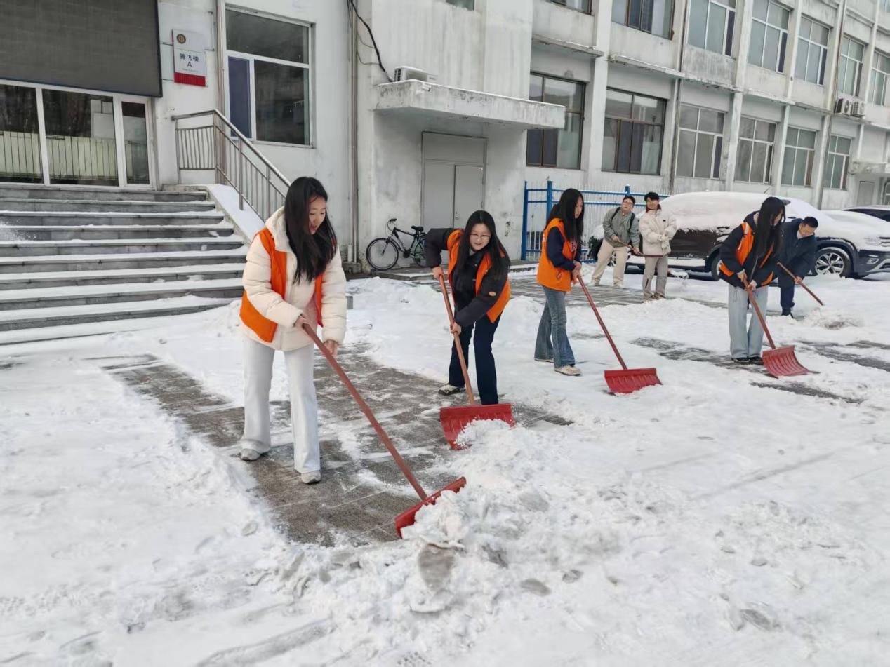 师生们齐心协力,默契配合,有的挥锹铲雪,有的挥扫清路,呈现出一派热火朝天的劳动景象,彻底清理了学院周边区域道路的冰雪,确保了师生的出行安全。