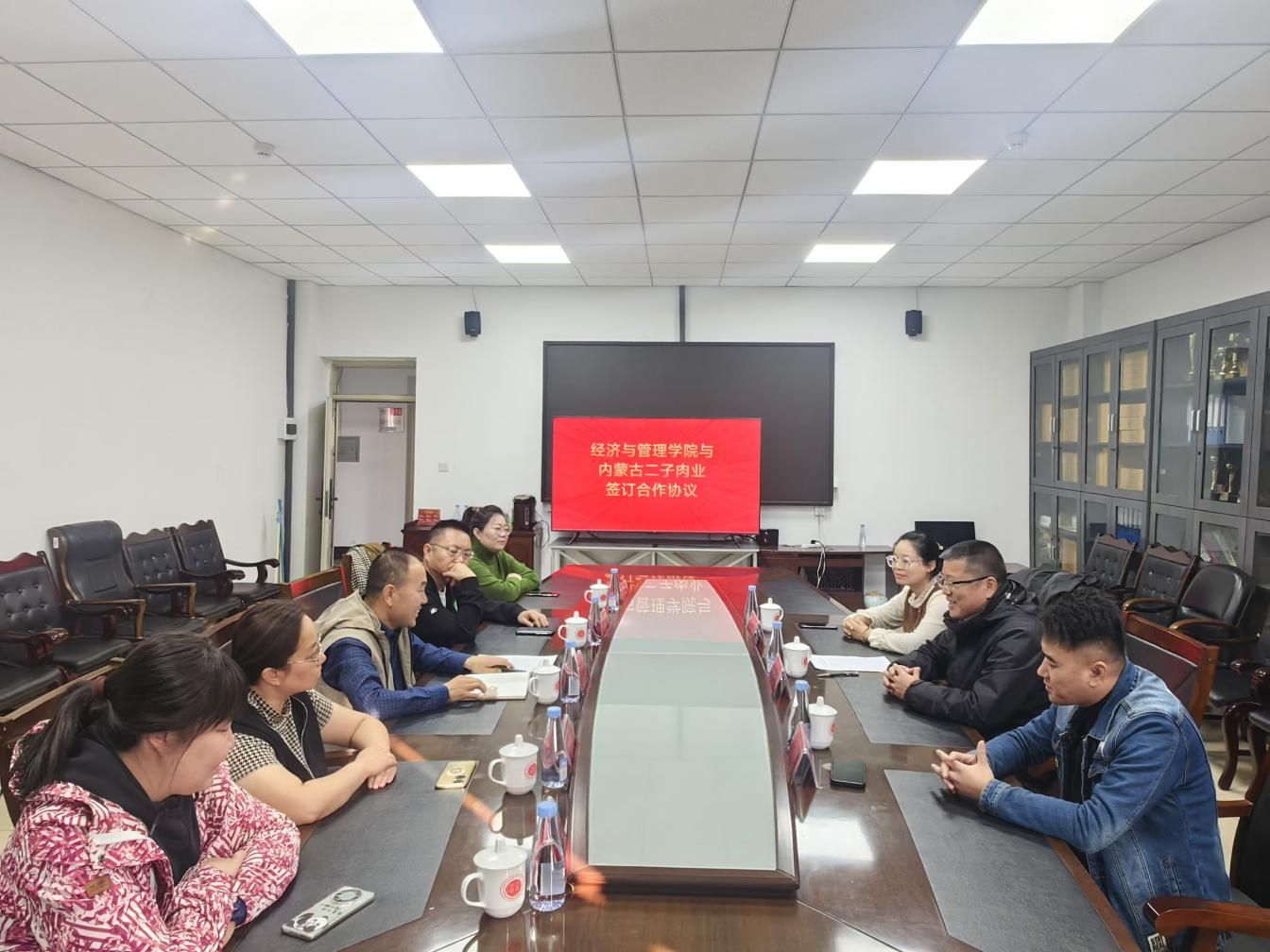 2024年11月6日上午,内蒙古二子肉业集团有限公司与太阳集团tyc5997在腾飞楼A座307举行社会实践与就业合作框架协议签订仪式。二子肉业集团有限公司研发中心主任程孝新、销售部经理白璐、人事行政主管孙梦娜,太阳集团tyc5997院长赵周华、副院长孙斌,相关专业负责人及教师参加活动。