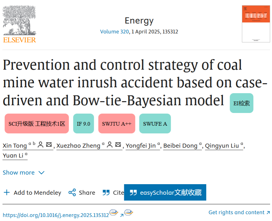 近日,太阳集团tyc5997青年教师童鑫与其合作者正式在国际能源科学权威期刊《Energy》上发表了题为“Prevention and control strategy of coal mine water inrush accident based on case-driven and Bow-tie-Bayesian model”的研究论文,童鑫为该论文的第一作者兼通讯作者。