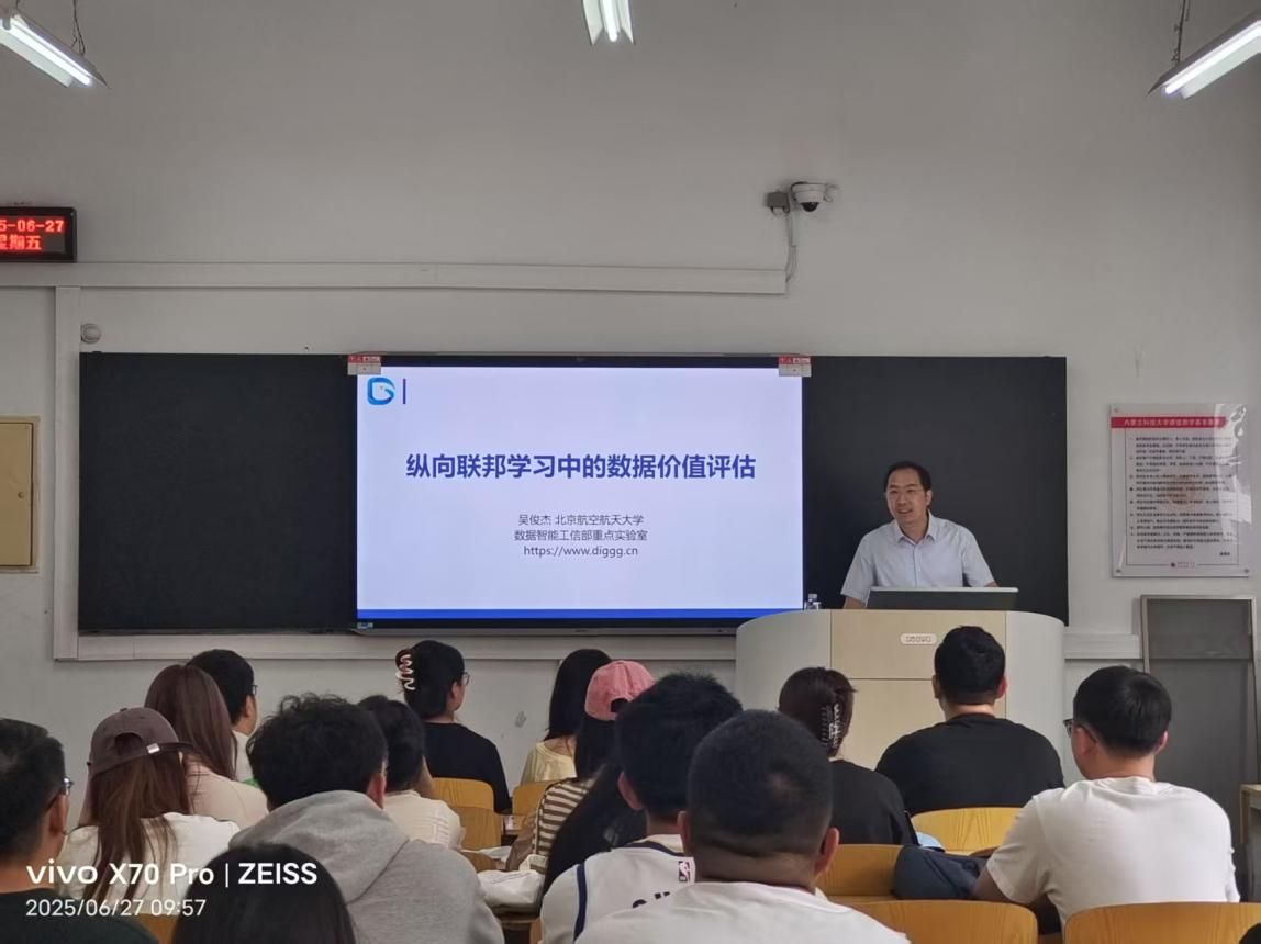 6月27日,北京航空航天大学吴俊杰教授应邀来到太阳集团tyc5997,就“基于联邦学习的数据价值评估”与师生们进行座谈交流和学术讲座,为师生们带来了一场精彩的学术盛宴。 讲座中,吴教授聚焦联邦学习框架下的数据价值评估问题,系统梳理了该领域的最新研究进展。他深入浅出地介绍了多种主流评估方法的理论基础、适用场景与优缺点。吴教授结合其团队的前沿探索,重点分享了如何克服数据异质性、通信成本、激励机制设计等实际挑战,提出了更高效与更公平的价值评估新思路和新框架,并通过生动的案例阐释了这些方法在实践中的应用潜力与价值。 互动环节气氛活跃,与会师生就联邦学习评估方法的计算效率、实际部署中的隐私与安全边界、不同行业应用的特殊性等问题,与吴教授进行了深入的探讨和交流。吴教授渊博的学识、深刻的洞见以及对前沿方向的精准把握,赢得了在场师生的阵阵掌声。 此次学术交流活动吸引了众多师生参与,现场气氛热烈。吴教授的讲座不仅深化了师生们对联邦学习及数据价值评估这一关键问题的理解,也为学院相关学科方向的建设和人才培养提供了重要启发。